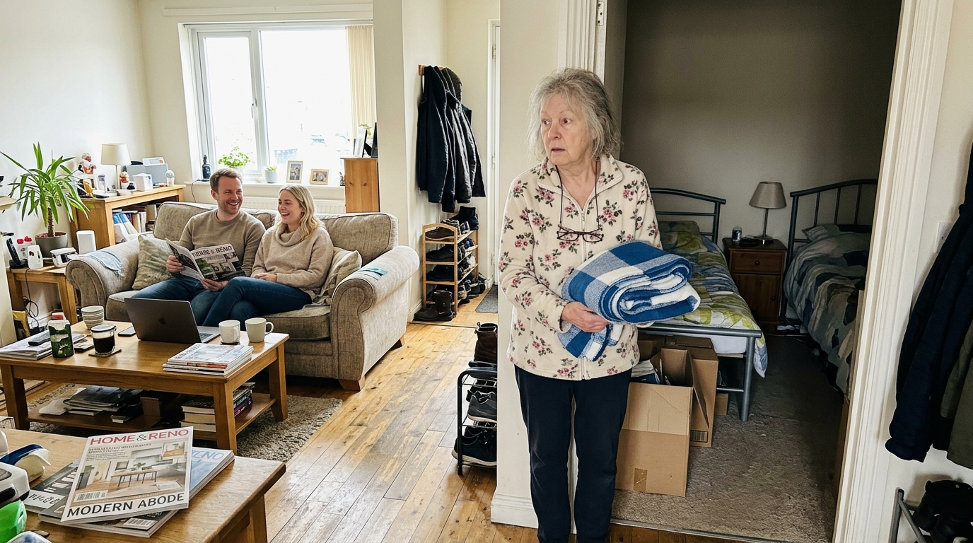 „Mama, aš galvojau. Tas vidurinysis kambarys, tas su tavo televizoriumi — mes tikrai jį galėtume panaudoti. Mums reikia daugiau vietos. Tas mažas kambarys gale tau būtų tinkamas, ar ne?“