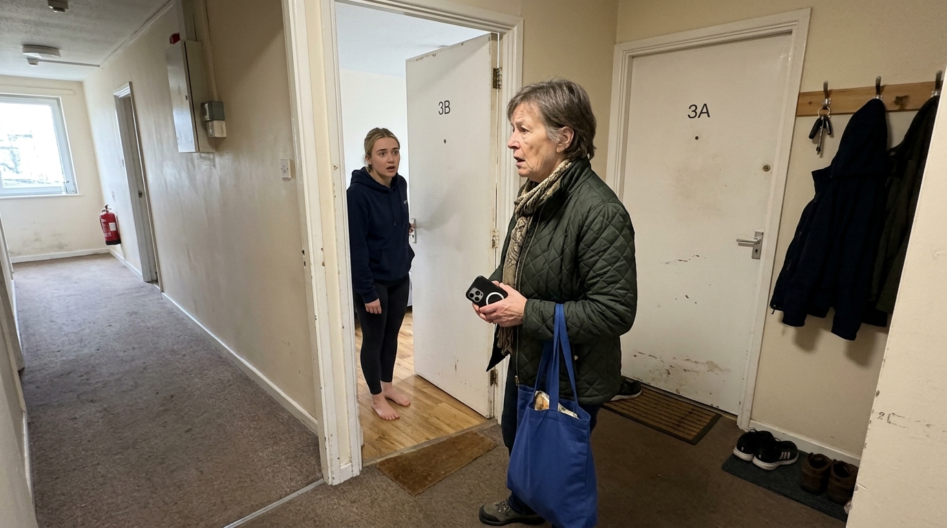 Jo vietoje: paprastas pilkas kilimėlis be užrašo. Nuspaudžiau skambutį. Duris atidarė moteris — jauna, gal trisdešimties, tamsiaplaukė, sportinėje aprangoje, rankoje laikanti arbatos puodelį.